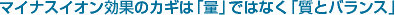 大切なのは、「イオンバランス」です。マイナスイオン効果を得るためには、プラスイオンを抑えて